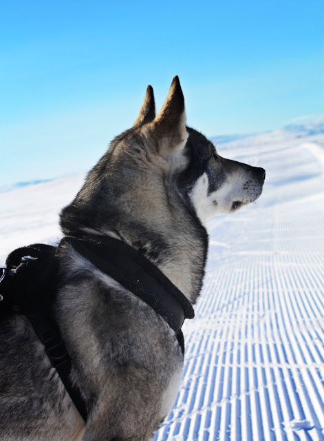 Superfin skare, så Loova, Milou och jag begav oss ut på en härlig och solig promenad över myrarna. På ett skoterspår så hittade jag även enormt stora tassavtryck från el monstro eller något. Jag hoppas ju på att det är spåret från någon av byns rätt så stora hundar, som tinat upp och på så sätt blivit så enorma...eller? Men större än min hand!? Samtidigt så kan dom inte ha varit där allt för länge, eftersom spåret används då och då. Det är kanske ändå en dinosaurie som varit på promenad.